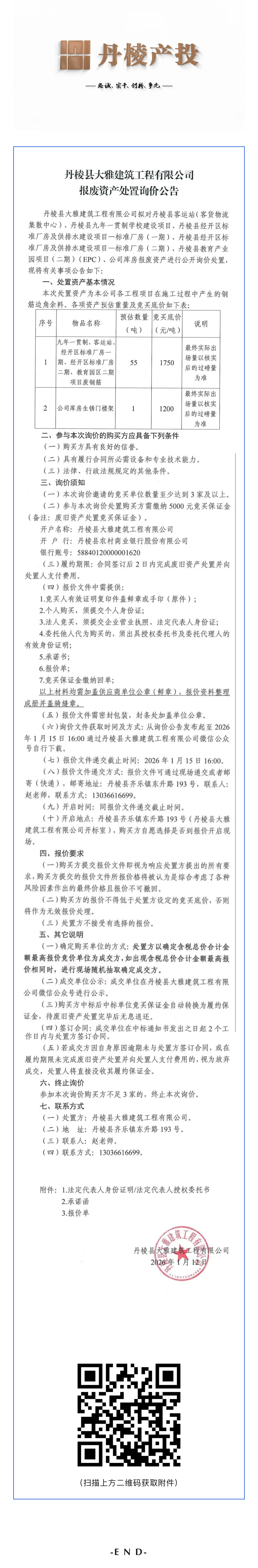 丹棱縣大雅建筑工程有限公司報廢資產(chǎn)處置詢價公告